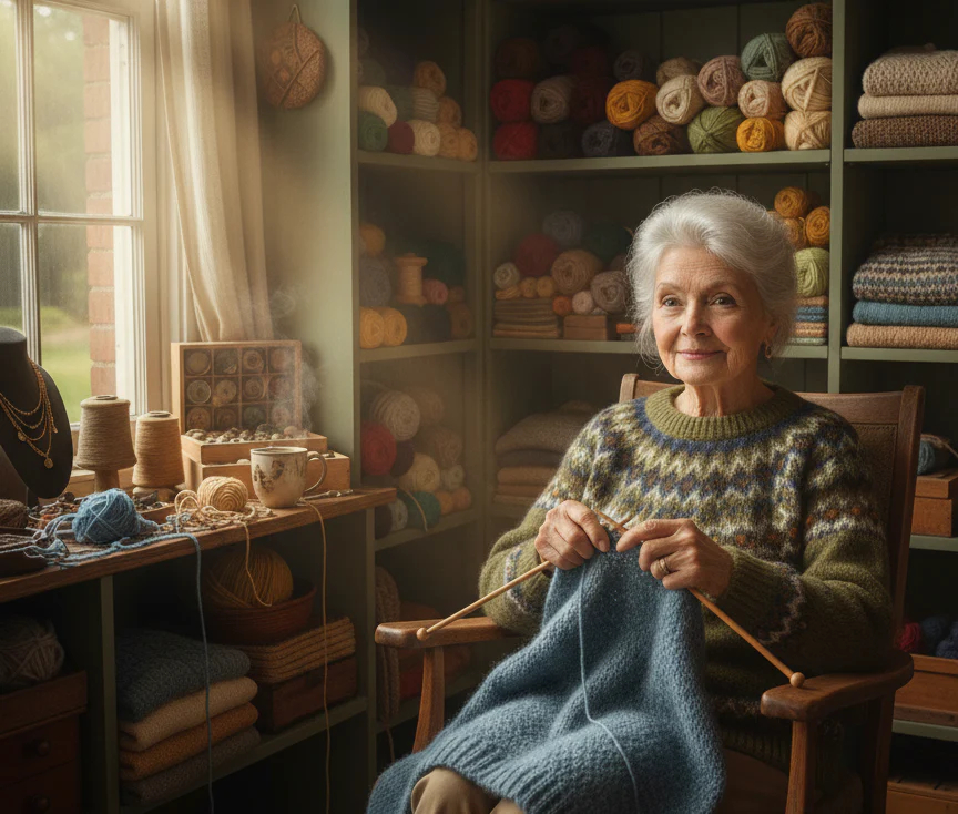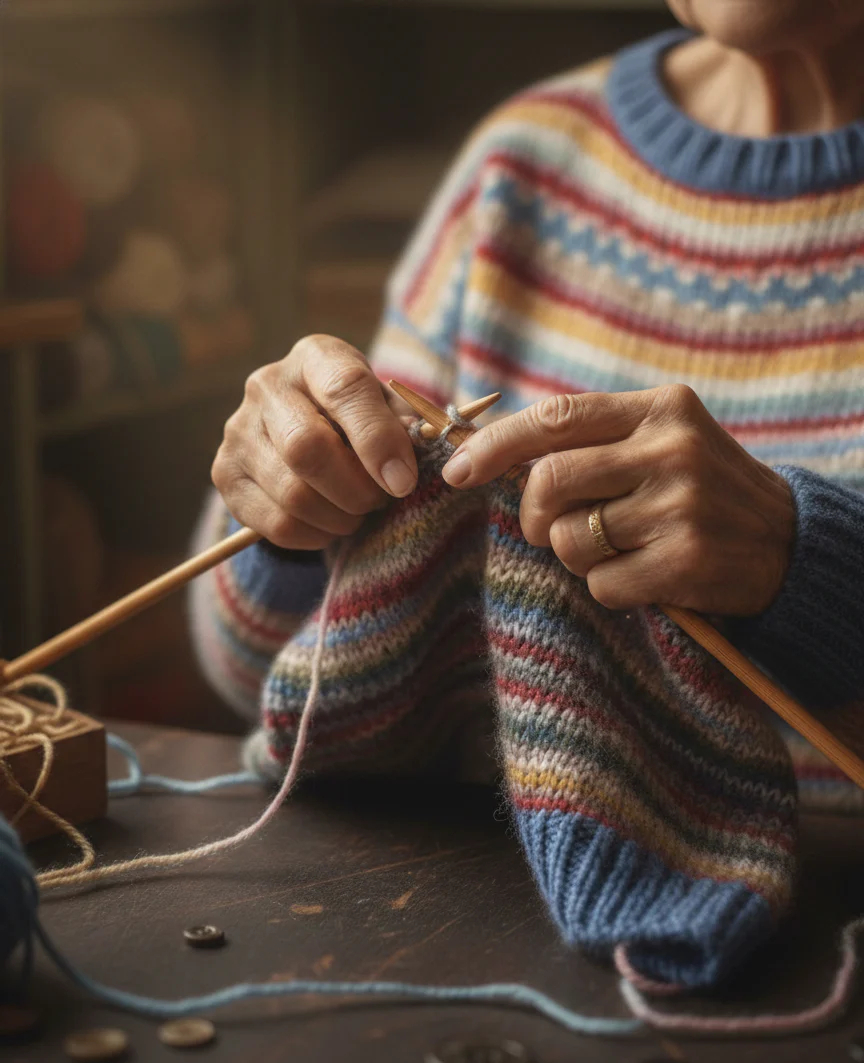 For over 30 years, I've found peace in my knitting needles, creating sweaters that tell quiet stories of care and beauty. Each begins with a sketch, a cup of tea, and a touch of inspiration from the world outside my window.